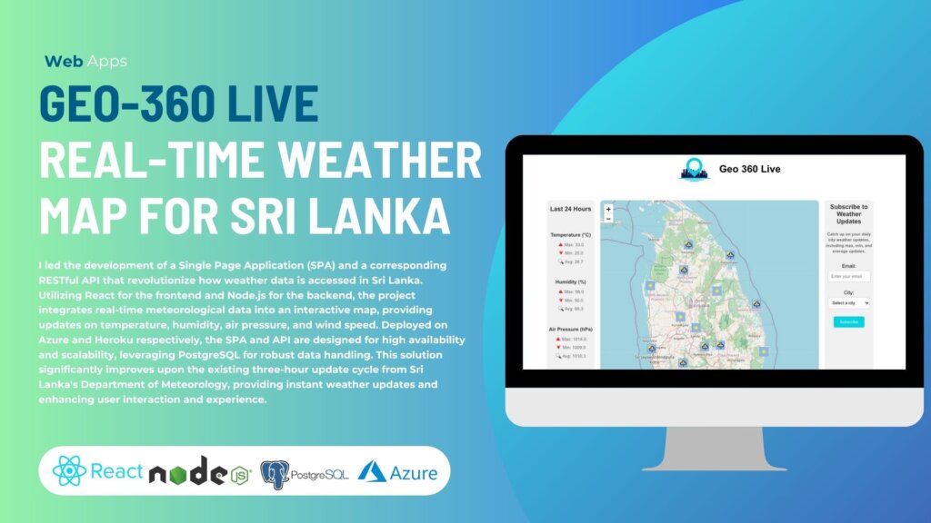 I led the development of a Single Page Application (SPA) and a corresponding RESTful API that revolutionize how weather data is accessed in Sri Lanka. Utilizing React for the frontend and Node.js for the backend, the project integrates real-time meteorological data into an interactive map, providing updates on temperature, humidity, air pressure, and wind speed. Deployed on Azure and Heroku respectively, the SPA and API are designed for high availability and scalability, leveraging PostgreSQL for robust data handling. This solution significantly improves upon the existing three-hour update cycle from Sri Lanka’s Department of Meteorology, providing instant weather updates and enhancing user interaction and experience.